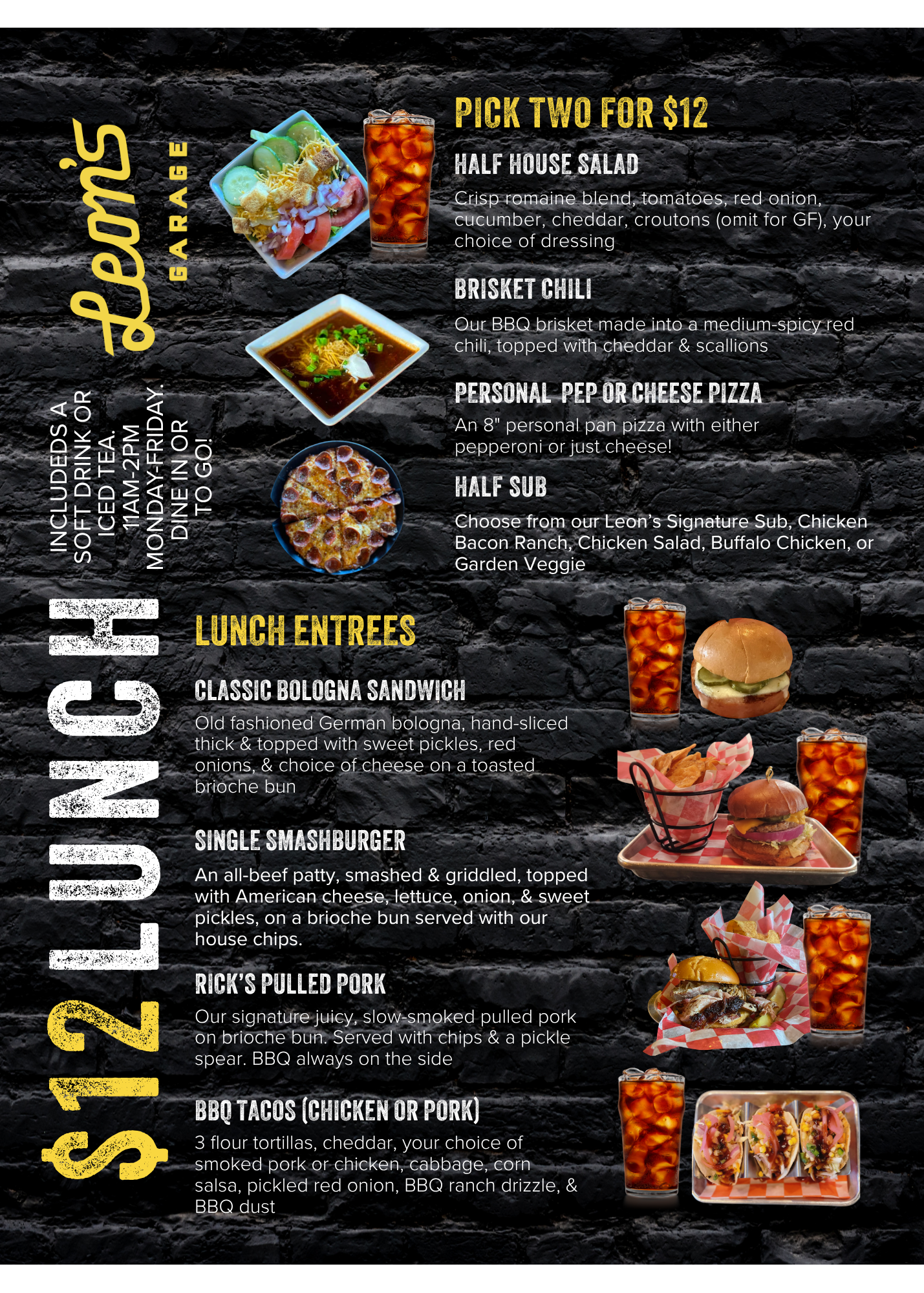 $12 Lunch · $12 Lunch · $12 Lunch · Big flavor, small price. Our $12 Lunch Menu is available Tuesday–Friday from 11AM–2PM for dine-in or takeout. Every order includes a soft drink or iced tea—because lunch should be easy. ORDER your $12 Lunch